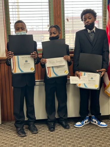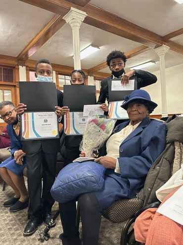 Griffin Day, Micah Barnett, and Westley Banks are the first recipients of the Wright Family Award with Mrs. Bertha M. Wright Wyatt (the last remaining Wright sibling). They each received a certificate and a $100 award. As a thank you, they surprised Mrs. Wyatt with flowers at Quinn Chapel A. M. E. Church in Chicago.